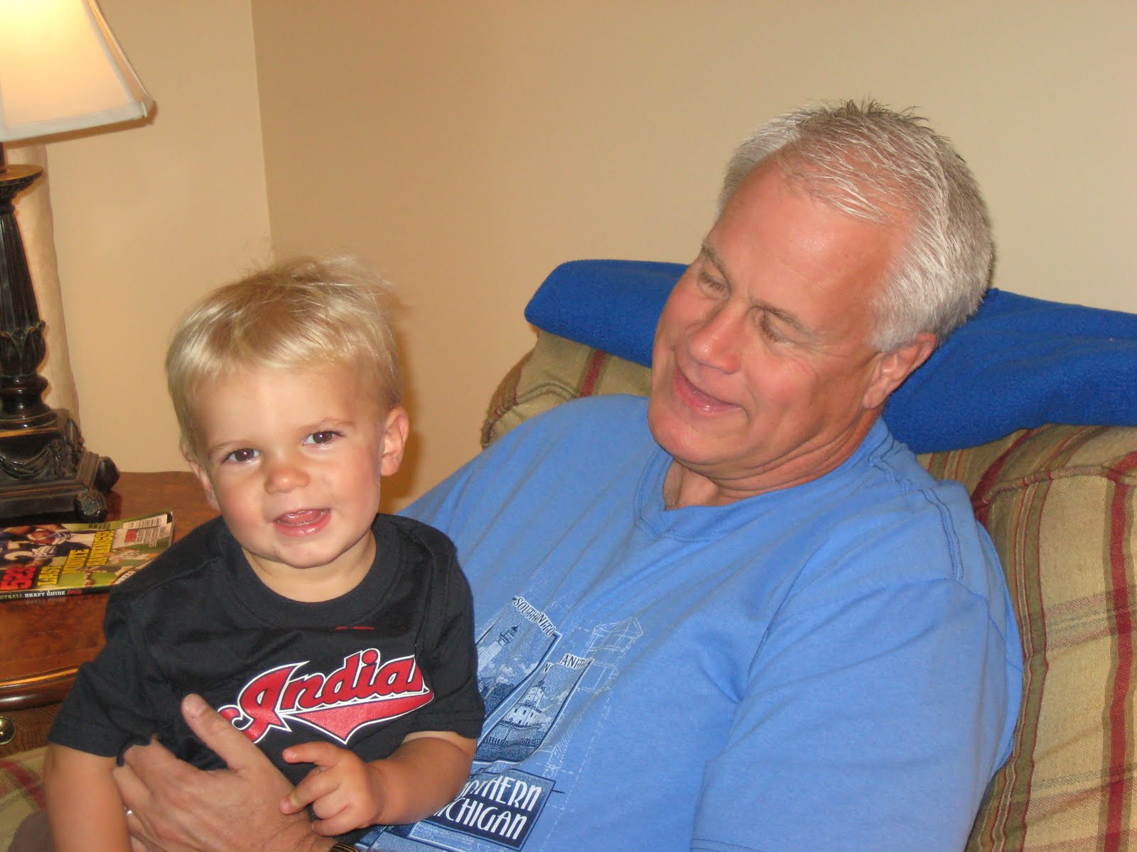 Drew is smiling because Papa is holding him. Papa is smiling because his grandson already roots for the Indians. Poor kid. He'll learn heartache early.